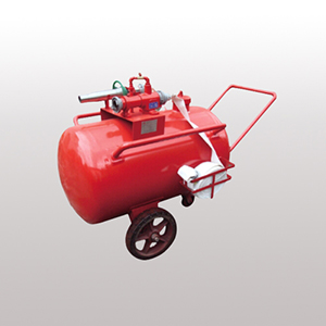 本裝置采用推車形式,在火災發生初期時,機動、靈活地推動該裝置到滅火現場進行滅火。本裝置可獨立作為消防防衛器材,也可配合大型固定式泡沫滅火系統起輔助補救作用。該移動式泡沫滅火裝置可由消防管網或城市供水管網、消防車、手抬消防泵提供壓力水源,經負壓比例混合器按一定的比例(3%或6%)與泡沫貯罐內的泡沫液形成泡沫混合液,再通過空氣泡沫產生器形成泡沫噴出滅火。